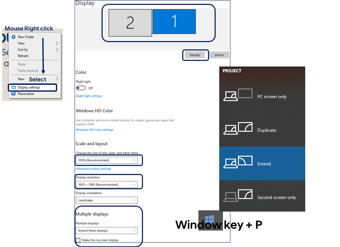 As the usage environment changes (ex: connection/disconnection from the docking station), the display environment may change. Make sure your other display devices are recognized or set to ‘Show only 1’ , ‘2’ or ‘disconnected’. You can also check by pressing Windows key + P.